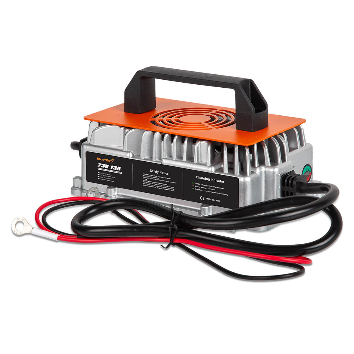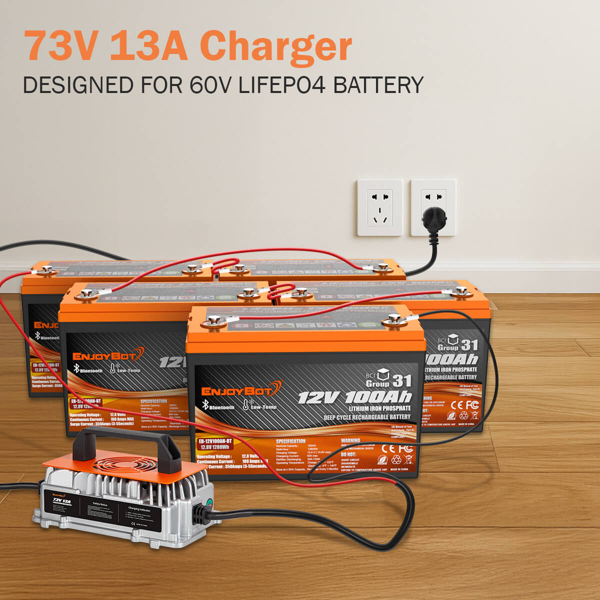 Enjoybot 73V 13A lithium battery charger is specifically designed for 60V LiFePO4 lithium batteries. It takes 7.7 hours to fully charge a 60V 100Ah battery set.