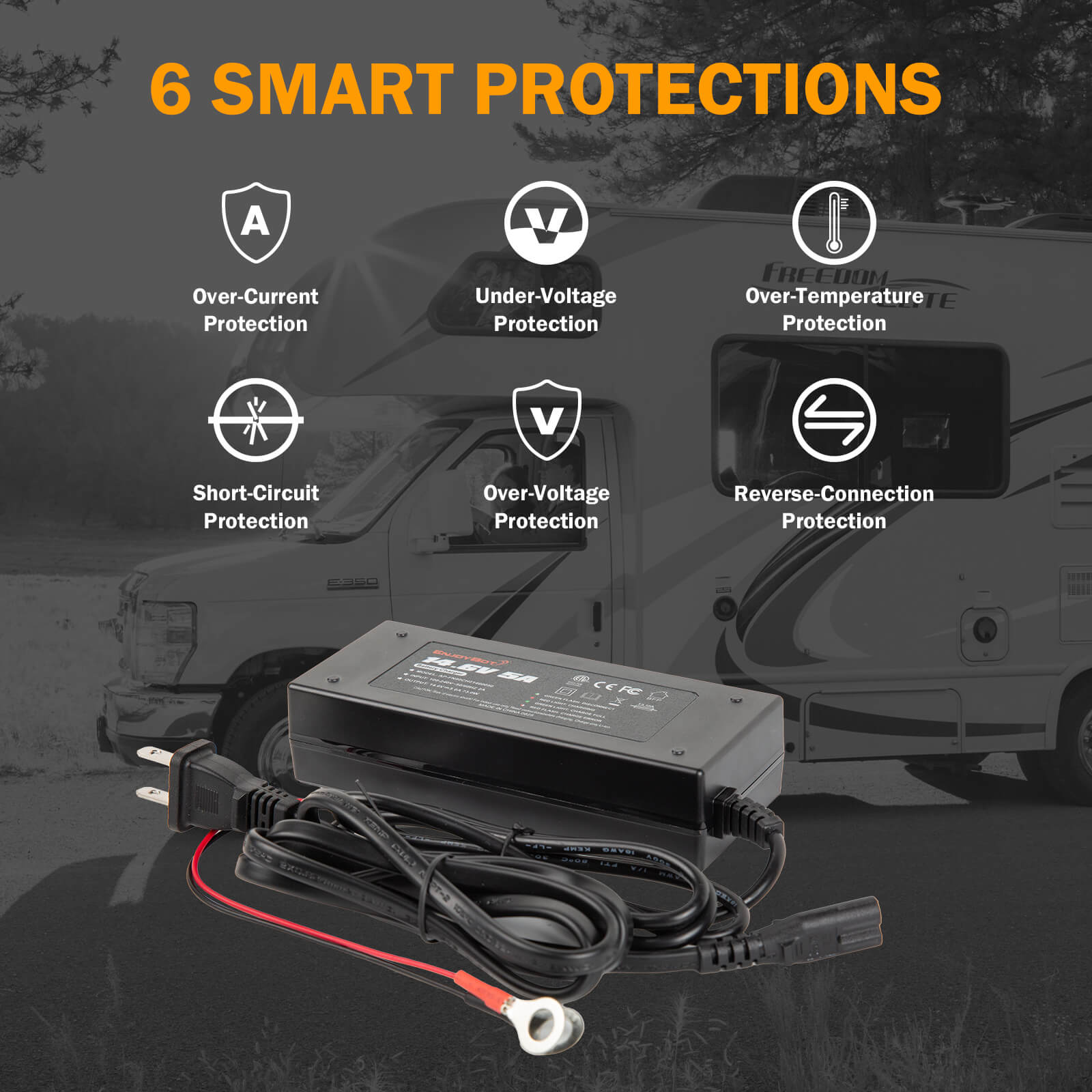 [Multiple Safety Protections] Includes short-circuit, over-voltage, reverse polarity, and over-temperature protection to prevent damage.
