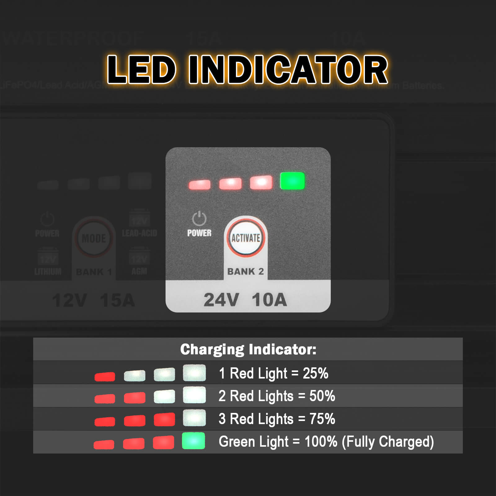 [All-in-One Dual Voltage Charging Solution] This dual-output smart charger delivers fast, reliable power with 15A on the 12V bank and 10A on the 24V bank. The 12V bank offers selectable modes for Lithium, AGM, and Lead-Acid batteries, with a memory function that recalls your last choice. The 24V bank is dedicated to lithium batteries, ensuring safe and efficient charging.