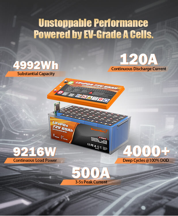 Built with automotive-grade LiFePO4 cells, this 72V 65Ah lithium battery delivers an impressive 4992Wh capacity and 9216W of stable output. With a continuous discharge of 120A and a 500A peak (3–5 seconds), it’s ready to handle high-demand motors up to 5kW. Designed for the long haul, it offers 4000+ deep cycles and a lifespan of up to 10 years.