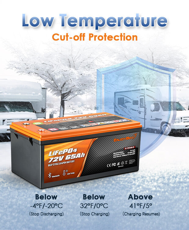 A: Enjoybot 72V 65Ah lifepo4 battery has low-temperature protection built-in. Charging is automatically cut off below 32°F (0°C), and discharging stops below -4°F (-20°C) to prevent damage. It's designed to stay safe and functional in winter conditions.