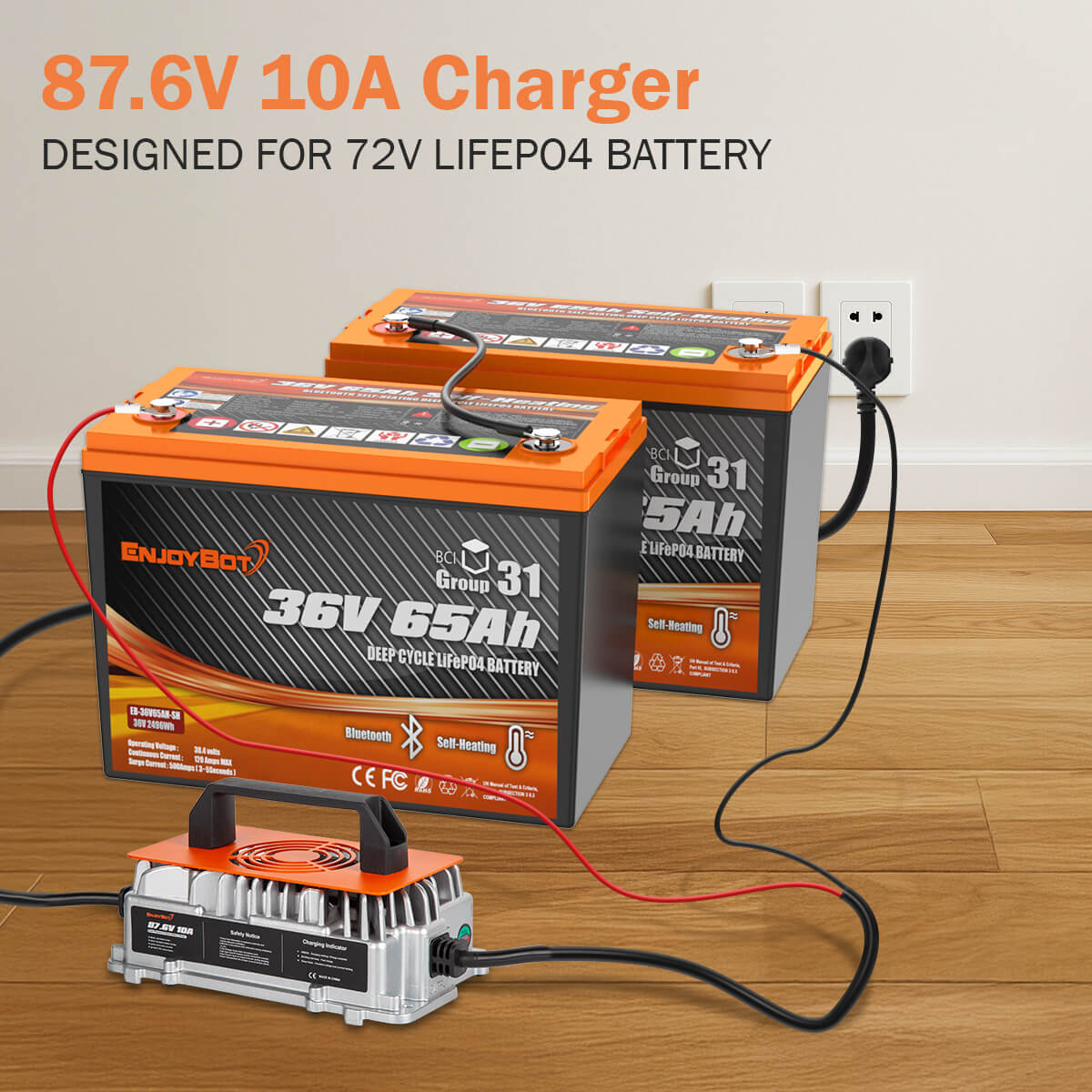 Enjoybot 87.6V 10A lithium battery charger is specifically designed for 72V LiFePO4 lithium batteries. It takes 6.5 hours to fully charge a 72V 65Ah battery, and as well as 10 hours for a 72V 100Ah battery.