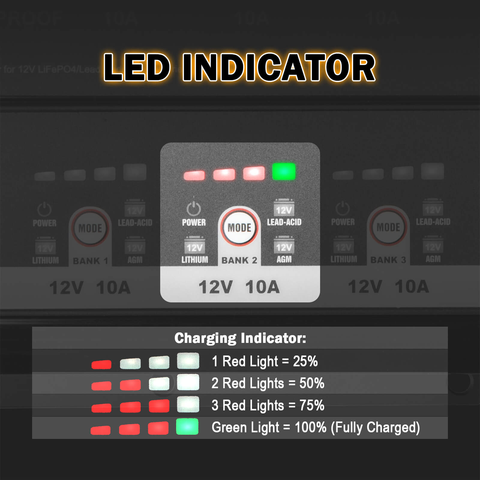 [3-Bank Fast Charging for 12V Batteries] Charge three 12V batteries at once with 30A total output (10A per bank). Easily switch between Lithium (LiFePO4), AGM, and Lead-Acid battery types to suit your power system.