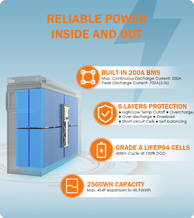 Built with 8 premium Grade-A prismatic LiFePO₄ cells and a heavy-duty 200A BMS, this 2560Wh lithium battery delivers reliable, long-lasting energy. Enjoy 200A continuous discharge and up to 700A peak output (3–5s)—perfect for powering large RV appliances, trolling motors, or off-grid solar setups. Expand with up to 4S4P connections to build a massive 48V 800Ah battery bank.