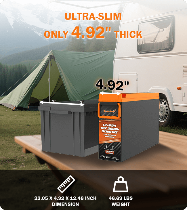 At only 4.92 inches thick, the Enjoybot 12V 200Ah Slimline LiFePO₄ Battery is designed to fit where other batteries can’t. Perfect for RVs, boats, and tight storage compartments, this space-saving design gives you maximum power without taking up valuable room. More space for gear, more freedom for your adventures.