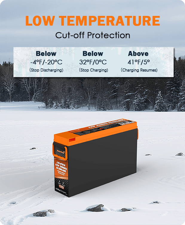 A: This 12V 200Ah LiFePO₄ battery has an automatic cutoff that stops charging below 32°F and resumes charging at 41°F. It ensures safe use in cold weather.